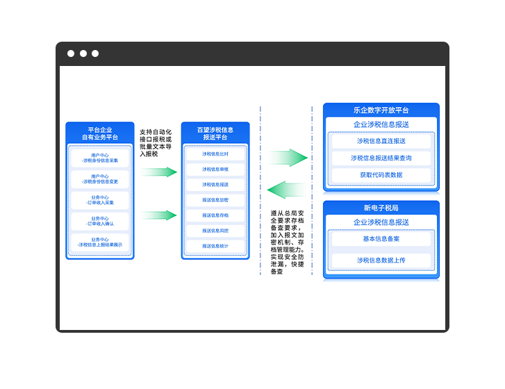百望股份为企业提供符合互联网涉税信息报送及申报解决方案,连接电子税局与乐企平台,助力平台企业完成涉税信息合规报送,并助力为从业人员办理扣缴申报、代办申报,支持云化部署与本地部署,有效解决报送难题和错报漏报风险,助力企业轻松应对监管要求。