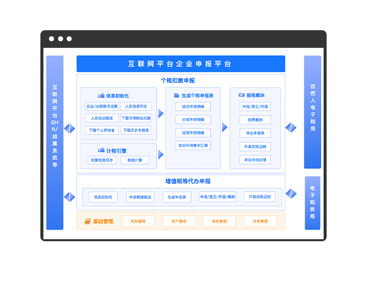 扣缴申报:申报初始化—人员信息报送—收入信息报送—直连申报—备案归档; 企业税申报:申报初始化—数据采集—税额计算—税局申报—税务归档; 增值税待办申报及汇总申报:申报初始化、自动获取从业者本期收入生成预申报表、核对/编辑申报表数据、连接电子税局完成一键申报、申报完成执行缴款及完税凭证下载