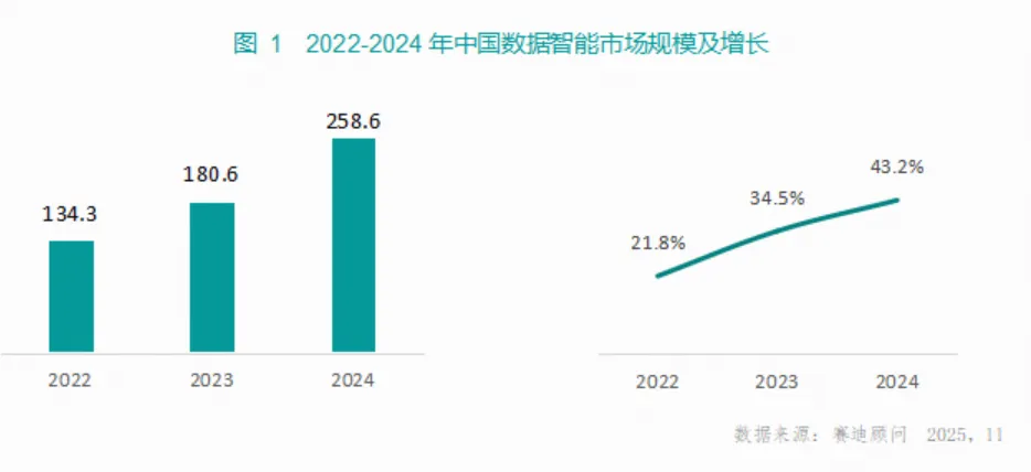 根据赛迪报告,2024年中国数据智能市场规模已达258.6亿元,同比增长高达43.2%,展现出强劲的增长势头。市场结构上,数据智能基础设施、平台与解决方案三大板块协同发展,其中一体化数据智能平台成为增长最快的细分领域。