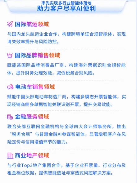 扎实全面的场景覆盖能力:百望股份服务超2800家大型集团企业,覆盖银行、制造、物流、汽车、快消、电商、地产等二十多行业的龙头企业,通过与这些行业龙头企业联合进行智能体创新实践,实现了多场景覆盖,显著帮助企业释放数据价值。