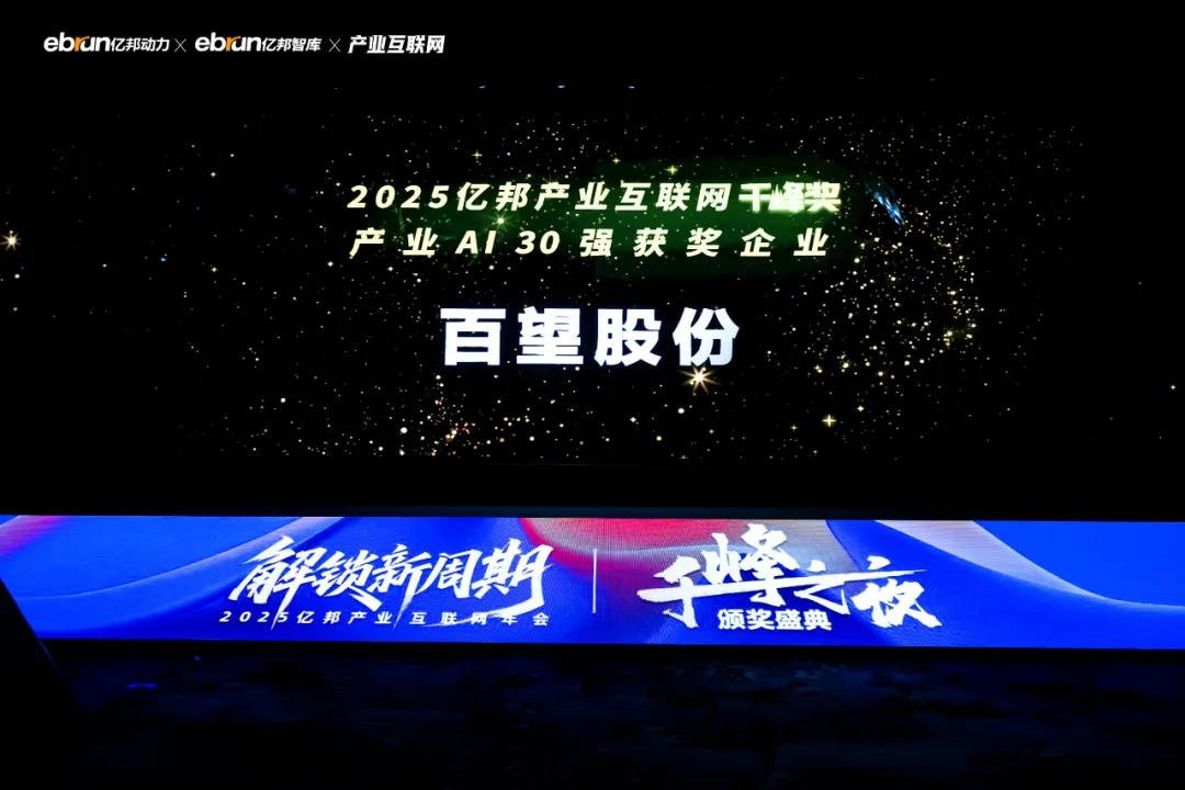 在“千峰之夜”上,产业互联网企业决策人、投资人及业界人士的共同见证“2025产业互联网千峰奖”评选结果。百望股份作为中国领先的数据智能服务商,凭借在产业AI领域的突破性实践,一举斩获“产业AI30强”殊荣。