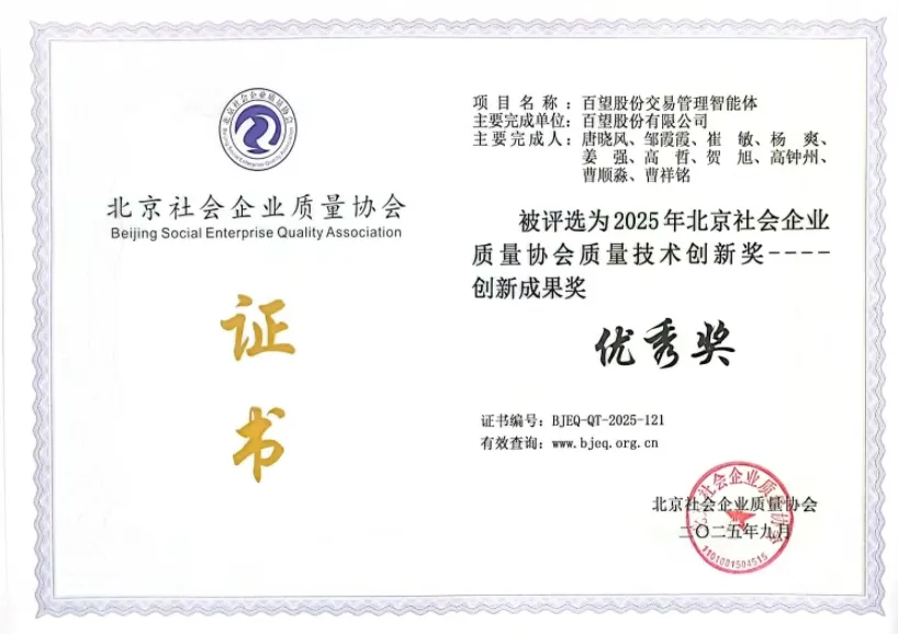 会上,协会公布了2025年质量技术创新奖评选结果,百望股份凭借持续的创新突破与行业应用成效,荣获“质量技术创新奖-优秀奖”!